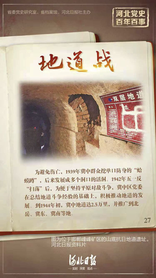 地道战是抗战时期冀中军民坚持平原游击战的一种特殊战斗形式,是冀中人民对敌斗争的伟大创举。为避免伤亡,1939年冀中群众挖单口防身的“蛤蟆蹲”,后来发展成多个洞口的活洞。1942年五一反“扫荡”后,冀中斗争环境异常残酷。为便于坚持平原对敌斗争,冀中区党委在总结地道斗争经验的基础上,积极推动地道的发展。在全区逐渐形成“四好”(好打、好钻、好藏、好跑)、“五防”(防水、防毒、防掘、防钻、防火)、“三通”(天通、地通、院户通)、“三连”(村落地道、联村地道、野外地道相连)、“三交叉”(高房、院内、地道火力交叉网和村边、街道、地道火力交叉网)的整体地道战阵地。到1944年初,冀中地道达2.5万里,并推广到北岳、冀东、冀南等地。地道战的广泛开展,对坚持和恢复抗日根据地起了重要作用。