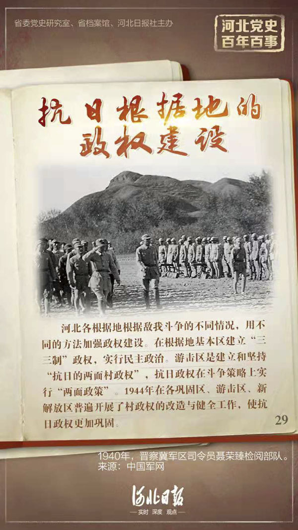 河北各根据地根据敌我斗争的不同情况,用不同的方法加强政权建设。在根据地基本区建立“三三制”政权,实行民主政治。这种政策规定在政权工作人员中,共产党员、非党的左派进步分子和中间派应各占1/3。通过开展民主选举运动,使河北各根据地的各级政权实现了“三三制”原则。游击区是建立和坚持“抗日的两面村政权”,抗日政权在斗争策略上实行“两面政策”。1944年在各巩固区、游击区、新解放区普遍开展了村政权的改造与健全工作,使抗日政权更加巩固。根据中共中央的指示,河北各根据地从1942年开始精兵简政。不断加强政权建设,对巩固和发展根据地起了重要作用。
