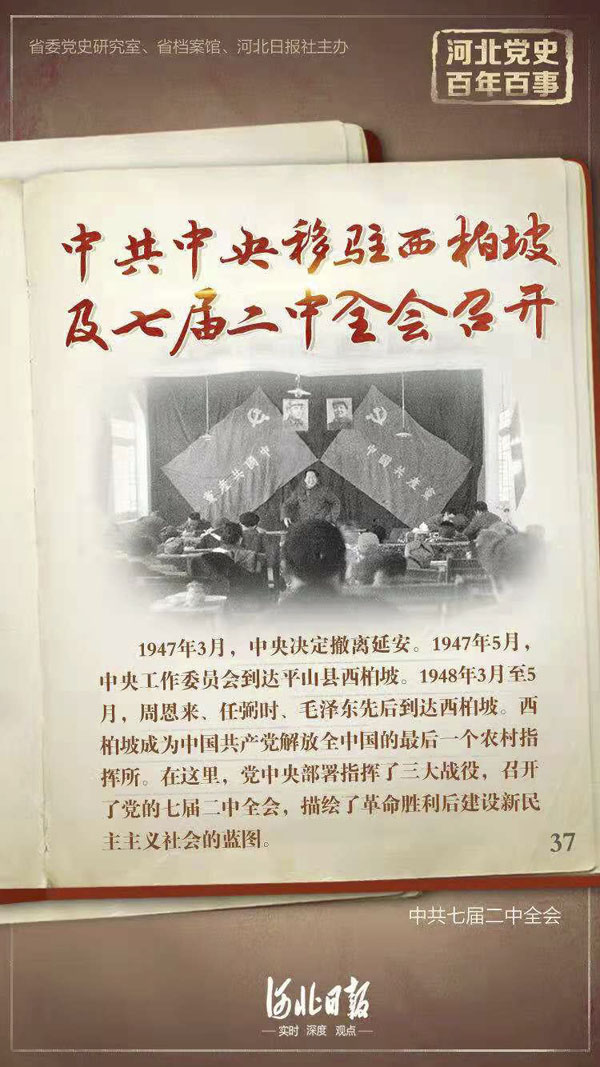 1947年3月,国民党重兵进攻延安,中央决定暂时撤离延安。此后,由毛泽东、周恩来、任弼时率中央机关和解放军总部转战陕北。由刘少奇、朱德、董必武组成的中央工作委员会转移到晋察冀。由叶剑英、杨尚昆组成中央后方委员会。1947年5月,中央工作委员会到达地理位置优越、群众基础好的平山县西柏坡。1948年3月,中央后方委员会也到达西柏坡。1948年4月,周恩来、任弼时到达西柏坡,与中央工委会合,5月27日,毛泽东从阜平到达西柏坡。西柏坡成为中国共产党解放全中国的最后一个农村指挥所。在这里,党中央制定一系列重大的战略决策和政策,部署指挥了震惊世界、改变中国命运的三大战役,召开了党的七届二中全会,描绘了革命胜利后建设新民主主义社会的蓝图,对迎接革命胜利和新中国建设具有重大指导作用。