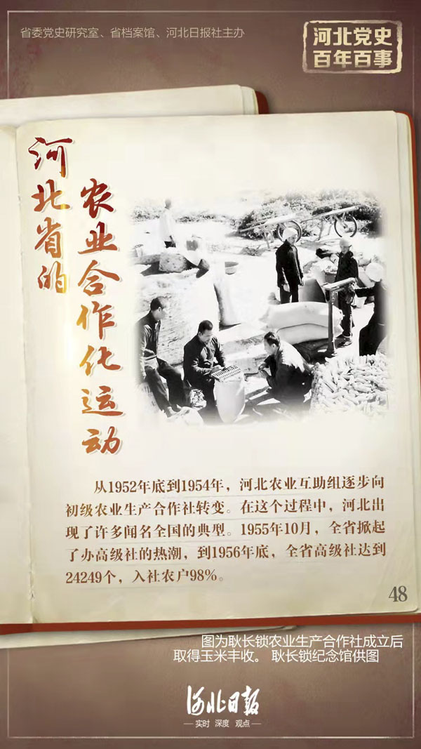 河北省的农业合作化运动最早可追溯到1944年,当时饶阳五公村以耿长锁为首的四户农民成立了“土地合伙组”。之后,一些老解放区都发展了农业互助合作组织。到1952年底,全省各种互助组已达到64.9万个,占农户总数的49%。从1952年底到1954年,河北农业互助组逐步向初级农业生产合作社转变,实行土地入股,按股分红,统一经营,采取包工包产、合理分配的管理方式。这既解决了个体农民的生产困难,又保持了农民对土地牲畜的所有权,既调动了农民个体积极性,又利于发挥集体力量。1953年,全省办初级社3645个,到1954年底发展到了10.5万个。在这个过程中,河北出现了许多闻名全国的典型,如被毛泽东誉为“我们整个国家的形象”的遵化西铺的“穷棒子社”,被毛泽东誉为“五亿农民方向”的安平南王庄3户贫农办的社等。1955年10月,根据中央七届六中全会精神,全省掀起了办高级社的热潮,到1956年底,全省高级社达到24249个,入社农户98%,全省实现了农业合作化,完成了对农业的社会主义改造,广大农民走上了集体化道路。