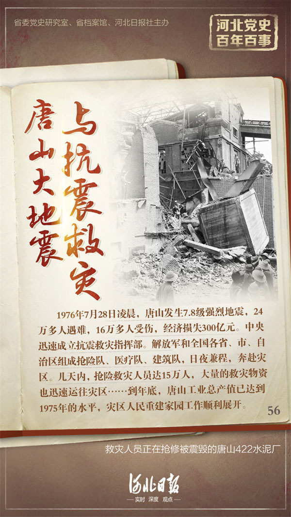 1976年7月28日凌晨3时42分,唐山发生7.8级强烈地震,造成24万多人遇难,16万多人受伤,经济损失300亿元。地震发生后,重病中的毛泽东得知消息后第一时间作出指示,委托中央其他领导同志组织抗震救灾工作,要求迅速派慰问团去唐山,慰问灾区人民,安置好灾民生活。中央成立抗震救灾指挥部,决定由河北省委、省军区和北京军区成立河北省唐山抗震救灾前线指挥部和后勤指挥部,省委第一书记刘子厚等到现场领导抗震救灾工作。解放军和全国各省、市、自治区组成抢险队、医疗队、建筑队日夜兼程,奔赴灾区。几天之内,抢险救灾人员达到15万人。同时,大量的救灾物资也迅速运往灾区。