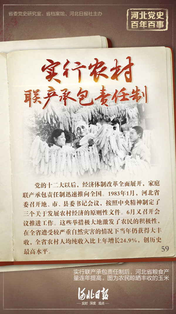 党的十二大以后,经济体制改革全面展开。农村的家庭联产承包责任制迅速推向全国。1983年1月,中共中央印发《当前农村经济政策的若干问题》的通知。同月,河北省委及时召开地、市、县委书记会议,按照文件精神制定了《促进联产承包责任制向横宽纵深发展》《发展专业户、重点户和多种形式合作经济》《加强农业技术推广工作》等三个关于发展农村经济的原则性文件。6月,省委、省政府召开部分县委书记、县长会议,要求各级领导继续解放思想,跟上农村经济发展的新形势,树立发展社会主义商品生产的观点,继续稳定完善家庭承包制,落实承包合同,延长承包时间,积极扶持发展专业户、重点户和各种形式的经济联合体。