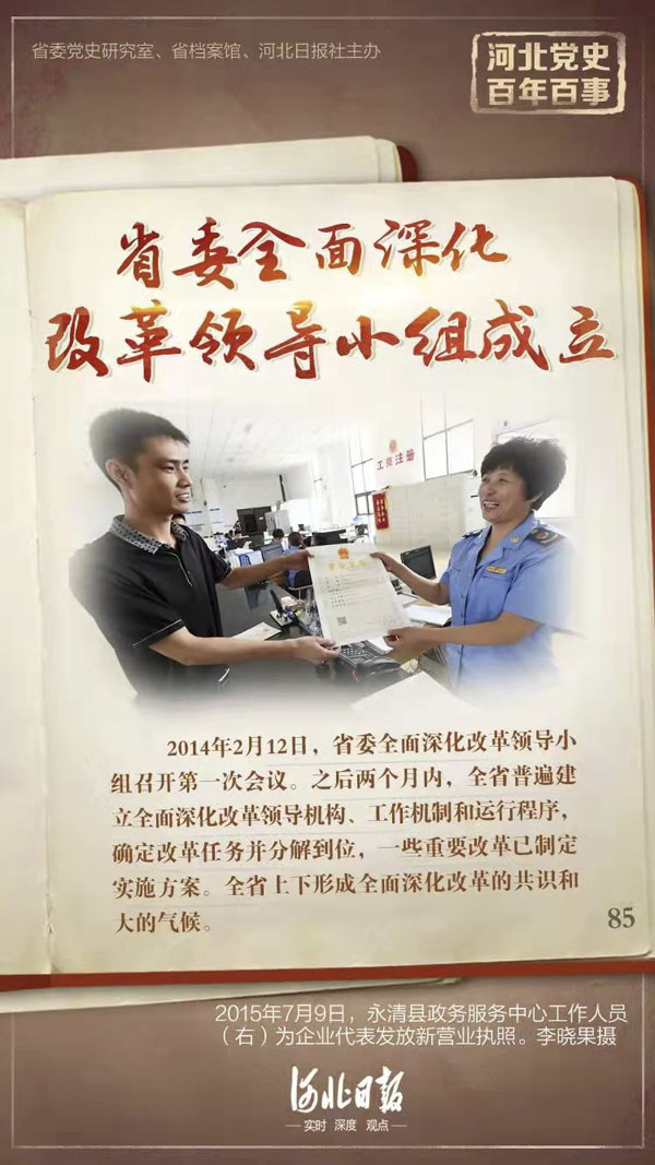 2014年2月12日,省委全面深化改革领导小组召开第一次会议,审议省委全面深化改革领导小组下设经济体制和生态文明体制改革、民主法治领域改革、文化体制改革、社会体制改革、党的建设制度改革和基层基础工作改革、纪律检查体制改革、农业和农村体制改革等7个专项小组人员名单;审议《省委全面深化改革领导小组工作规划》《省委全面深化改革领导小组专项小组工作规则》《省委全面深化改革领导小组办公室工作细则》以及《〈中共河北省委关于学习贯彻党的十八届三中全会精神的决议〉重要举措分工方案》《河北省2014年全面深化改革重要举措分工方案》。之后两个月内,全省普遍建立全面深化改革领导机构、工作机制和运行程序,确定改革任务并分解到位,一些重要改革已制定实施方案。全省上下形成全面深化改革的共识和大的气候。