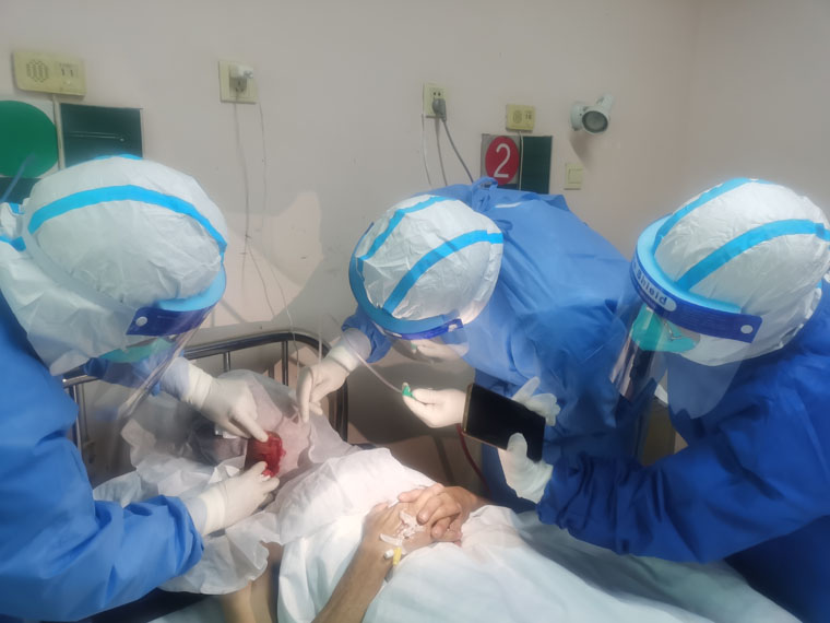 面对一名核酸阳性且糖尿病酮症酸中毒的患者,医务人员始终坚持生命至上的理念,冒着感染的风险,及时予以治疗和护理。护士张玉英、蔡丽莎等给患者一小时测一次血糖,根据医嘱调节胰岛素泵的速度,医生王耀贤、商文博共同诊治,使患者得到了及时救治,有效控制了血糖。一位自测抗原阳性的患者,因剧烈腹痛来诊,医生王光林即刻安排患者进行CT、抽血化验,请相关科室会诊,检查结果显示结石性胆囊炎,存在感染性休克的风险。护士王晓稳、崔晓洁给予生命体征监测、抗炎、退热、补液等一系列治疗,超声科医师进行超声引导下穿刺置管,从患者踏入发热门诊的诊区,大家都在争分夺秒抢救患者。一位喘憋不止的患者需要血液透析救治,医务人员把血液净化机推入发热门诊,经过2个小时的及时治疗,患者由于疾病本身引起的喘憋消失。