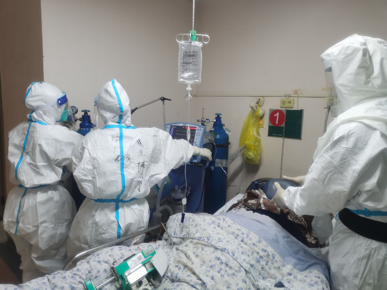 一名患新冠肺炎合并多器官功能衰竭患者来到发热门诊,病情危重、情况紧急,医护人员前赴后继地投入抢救工作,呼吸囊辅助通气、吸痰、气管插管、心肺复苏、静脉输液.......经过一轮紧张地抢救,成功跑赢了死神,挽救了生命。此时,医务人员防护服下的衣物已被汗水浸湿,脸上满是N95口罩的压痕,但大家依旧精神饱满,投入到新一轮细致而繁忙的工作。