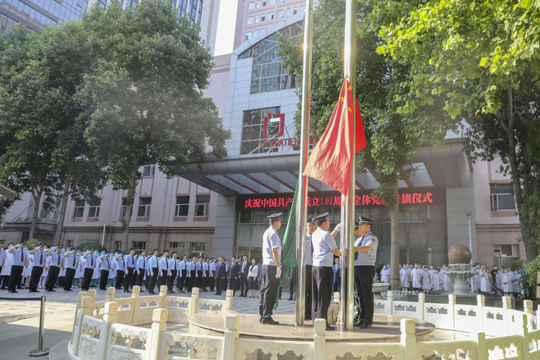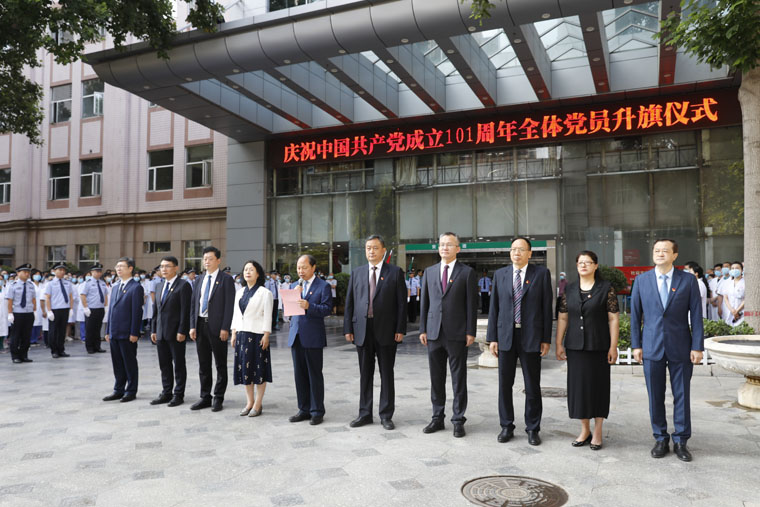 在本部和东院区隆重举行了庆祝中国共产党成立101周年全体党员升旗仪式。全体在院党政领导与广大干部职工、患者及家属一道满怀喜悦,共迎党的101岁生日。