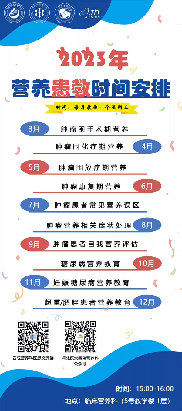每月最后一个周三下午,临床营养科营养师会通过线上、线下相结合的形式,对广大患者进行营养患教,受众主要是肿瘤、糖尿病及超重/肥胖患者及家属。每月有1个不同的主题,包括肿瘤不同时期营养干预、营养误区、相关症状处理、自我营养评估及糖尿病、超重/肥胖患者营养教育等内容。患教活动旨在充分发挥临床营养科的力量,为果冻传媒