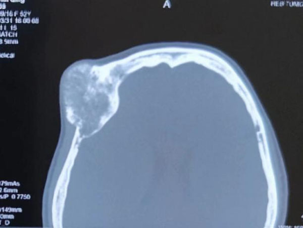 眼科。眼科郝玉华教授在检查中发现,患者右眼视力极低,右眼上睑下垂,眼球突出且运动明显受限。眼眶CT提示眶内巨大占位,几乎占据球后整个眶间隙。同侧额部颅骨骨质亦显示巨大肿瘤,约7*7 cm大小。患者已经有上睑下垂和视力明显下降的症状,表明肿物已经对眶上裂神经和视神经有一定压迫。