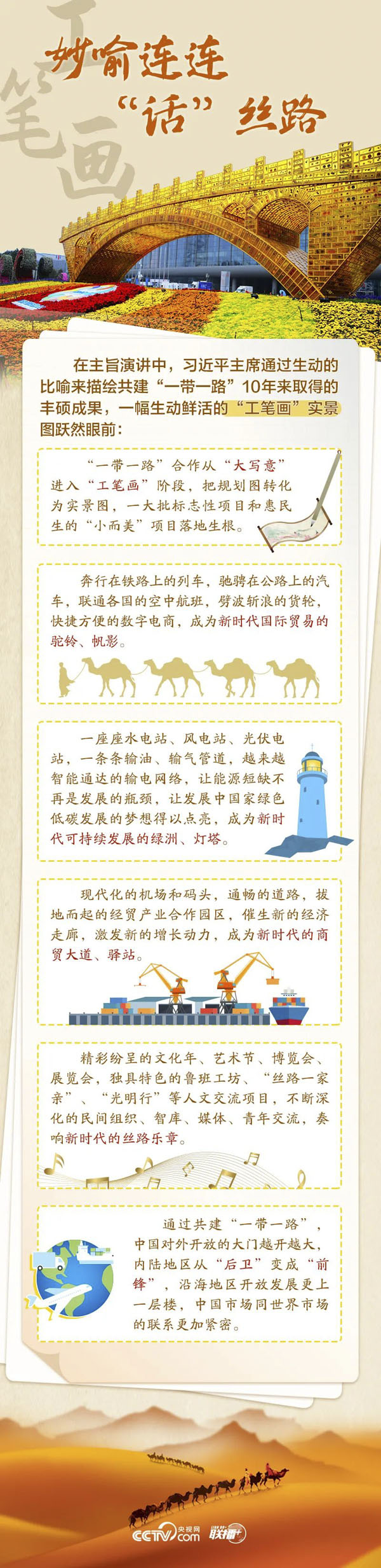 站在共建“一带一路”倡议走过十年这个标志性节点,这幅“工笔画”呈现怎样的实景图?高质量共建“一带一路”如何再出发?央视网《联播+》栏目从五个维度为您速读习主席讲话,与您一同学习。