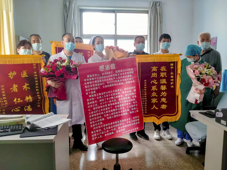 为给患者营造温馨安静的住院环境,团队成员自费采购了各种友情提示的标识布置在楼道和病房;为保证患者出入厕所安全,在门口准备防滑垫;多人多次给经济困难或行动不便的患者送饭、理发等,大家贴心的工作得到了患者及家属的一致好评。2022年护士节前夕,泌尿外科主任张爱莉收到了350余名患者联名写的一封感谢信和三面锦旗和鲜花,患者们表示,“感谢泌尿外科医护团队为他们的身体保驾护航,感谢住院期间的照顾”,这是医护团队以患者为中心的真实体现。
