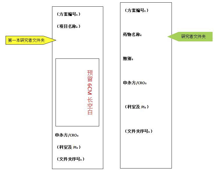 1.研究者文件夹需按归档目录顺序放入两孔黑色硬皮文档夹中,标记好文件夹序号,项目类别之间用相对应的塑料隔页纸分隔。侧签自上到下依次包含如下信息:方案编号、药物名称(第一本写项目名称)、期别、申办方/CRO、科室及PI、文件夹序号。