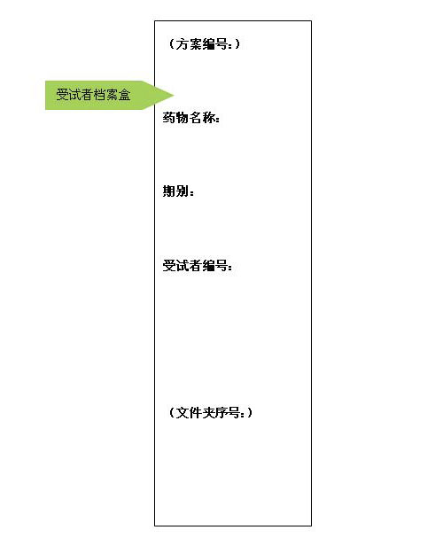 2.受试者的所有文件整理好按照受试者的编号装入蓝色档案盒,侧签自上到下依次包含如下信息:方案编号、药物名称、期别、受试者编号、文件夹序号。